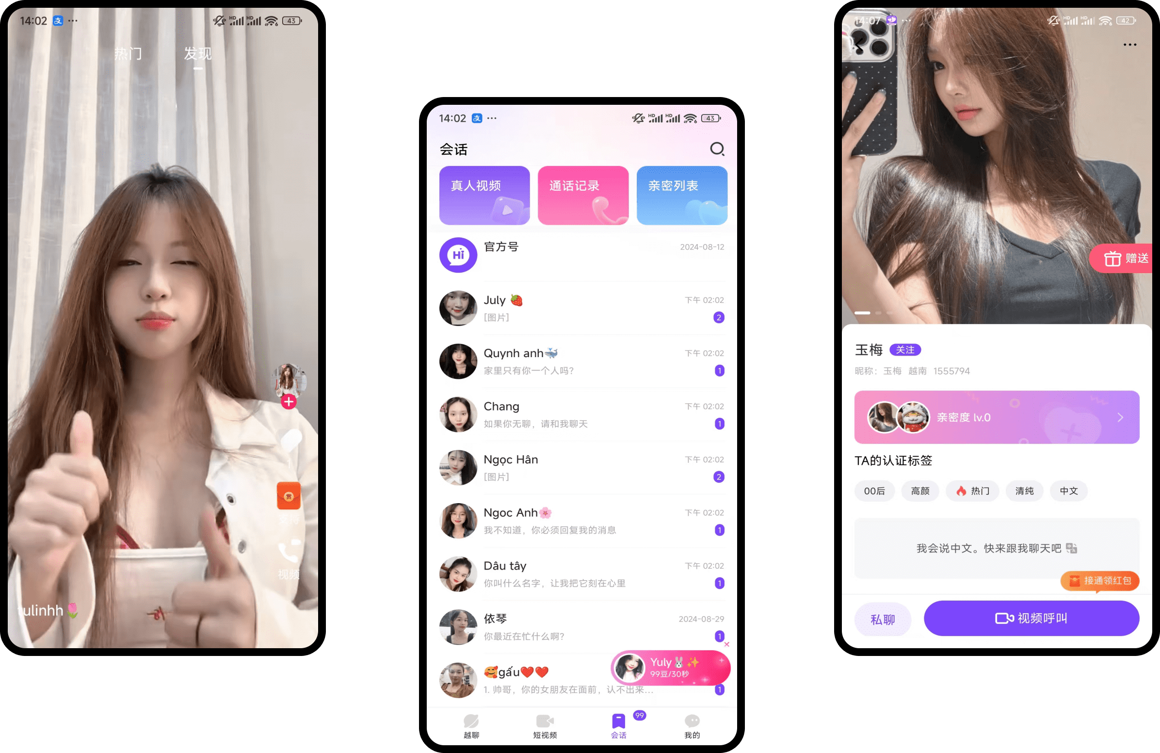 以随时匹配实时视频聊天、语音聊天、文字聊天,并实时翻译,方便两种语言的年轻人畅聊;用户可根据兴趣爱好进行视频匹配,寻找有缘人;有极速匹配功能,能进行文字交流、翻译、朗读,在交朋友的同时学习语言;还可以发布动态,了解越南女孩的生活动态和心思;提供找翻译官的功能,方便在越南当地在线预约翻译,对于商务、旅行等场景非常实用。